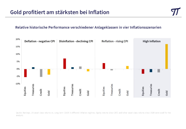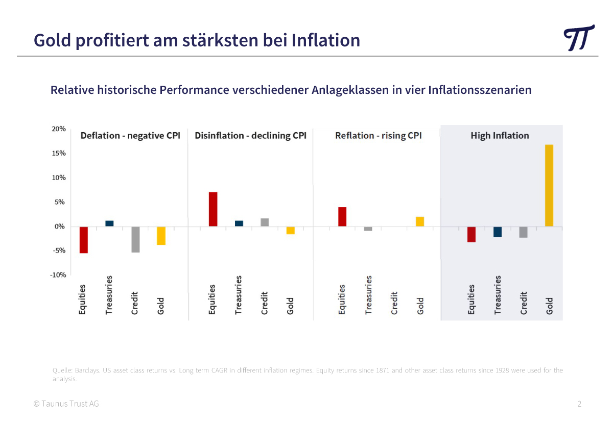 Während Anleihen dabei vor allem in deflationären Phasen ihre Funktion erfüllen, ist Gold unerlässlich in inflationären Phasen. Deshalb hat das berühmte 60/40 Portfolio (statische Vermögensallokation mit 60% Aktien und 40% Staatsanleihen) seine Beliebtheit auch erst ab den 80er Jahren entwickelt, denn im Hochinflationsumfeld der 70er Jahre hätten die Anleihen keinerlei Anlegerschutz geboten. Hier konnte hingegen Gold „glänzen“, das historisch in den meisten Inflationsphasen ein wertvoller Portfoliostabilisator war. Insofern können (und müssen) wir mit der aktuellen Goldpreis-Korrektur leben, um die stabilisierenden Eigenschaften von Gold für unsere Kunden zu vereinnahmen.