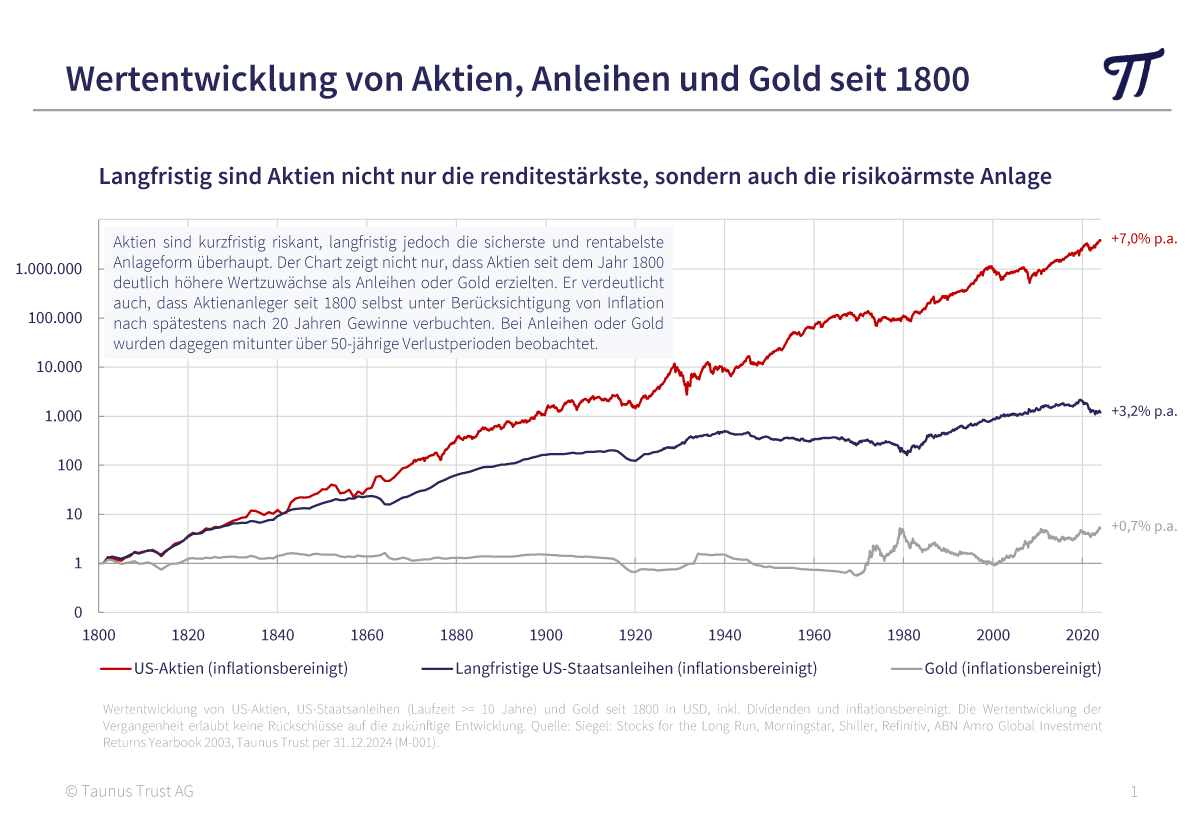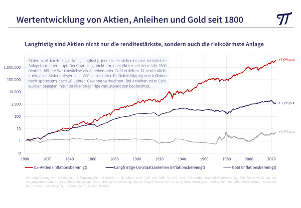 Da wir signifikant in Gold (und auch Goldminen) investiert sind, mag diese Antwort verwundern. Aber jeder der etwas anderes behauptet, belügt zumindest sich selbst. Zudem ist die Kursentwicklung von Gold für uns eher von untergeordneter Bedeutung. Denn auch wenn unsere Goldposition signifikant zu unserer Performance beigetragen hat, haben wir Gold nicht als Renditetreiber im Portfolio. Über die lange Frist zeigt sich, dass Gold zwar die Kaufkraft bewahrt hat, aber Aktien der dominante Werttreiber unter den liquiden Anlageklassen sind. Deshalb auch unser Fokus auf Aktien im Portfolio, während wir Gold (und Anleihen) nur als Beimischung sehen, um das Portfolio robuster zu machen und in Krisen zu stabilisieren.