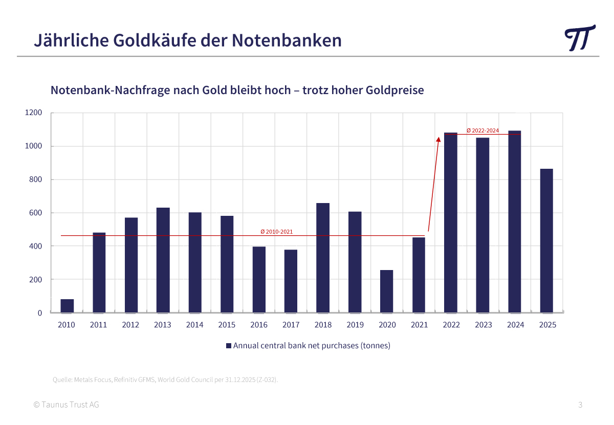 Ein u.E. ganz wesentlicher Aspekt spricht indes weiter für Rückenwind beim Goldpreis: das Kaufverhalten der Notenbanken ab 2022. Nach der Ukraine-Invasion Russlands wurde das Notenbank-Vermögen der russischen Zentralbank bei westlichen Lagerstellen eingefroren und sogar über eine Enteignung der Vermögenswerte oder zumindest deren laufender Erträge diskutiert. Unabhängig von der Beurteilung des russischen Vorgehens muss sich nun jede Notenbank auf der Welt die Frage stellen, ob ihre gehaltenen Staatsanleihen westlicher Nationen, die bei westlichen Banken lagern, in Zukunft noch uneingeschränkt zugänglich sind, sollte man aus welchem Grund auch immer nicht mehr als „Freund des Westens“ eingestuft werden. Daher scheinen viele Notenbanken vermehrt dazu übergegangen zu sein, ihre Vermögenswerte mit Gold zu diversifizieren, das sie in den eigenen Tresoren lagern und somit keine Enteignungen fürchten müssen. In der Folge ist die Zentralbanknachfrage nach Gold seit 2022 deutlich angezogen.