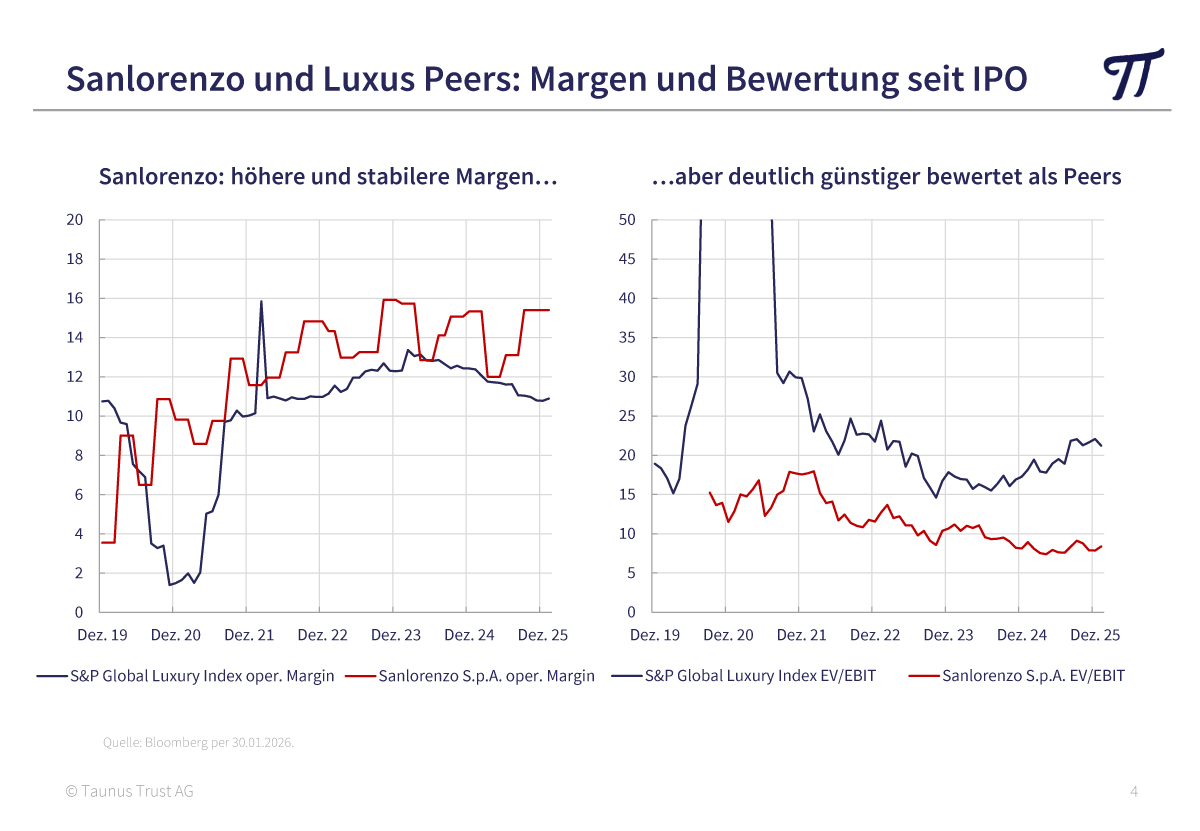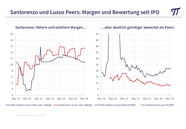 Und das Beste kommt zum Schluss: trotz all der Qualität und obwohl sich das Unternehmen gut entwickelt, kann man die Aktie mit einem niedrigen zweistelligen KGV und über 50% Discount zur Luxus-Peergroup kaufen und erhält 3% Dividendenrendite. Wesentlicher Grund dafür ist vermutlich, dass Sanlorenzo nur eine Marktkapitalisierung von gut 1 Mrd. EUR hat und davon nur knapp die Hälfte an der Börse gehandelt wird, was die Aktie für einen breiteren Investorenkreis uninteressant macht. Uns stört das nicht, wir konnten im Dezember problemlos eine Position aufbauen und bei unseren Größenordnungen ist auch ein Verkauf jederzeit möglich.