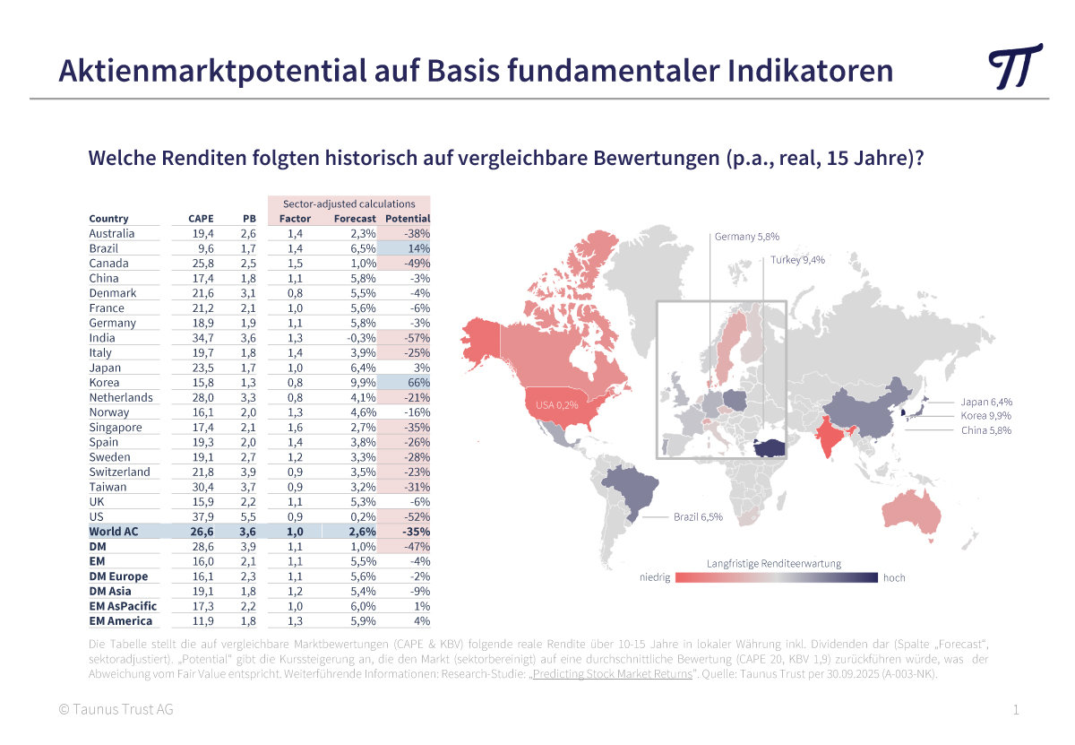 Wobei die globale Betrachtung zu kurz greift, denn dank der massiven Outperformance von US-Titeln und hier v.a. weniger dominanter Technologieaktien („Magnificent 7“) bestimmt der US-Markt mit gut 2/3 Gewicht mittlerweile die globale Aktienperformance nahezu allein. Gleichzeitig ist der US-Markt nach anderthalb Dekaden der Outperformance auch einer der am höchsten bewerteten Aktienmärkte und bietet aus historischer Bewertungsperspektive kaum noch Renditepotential für die kommende Dekade.