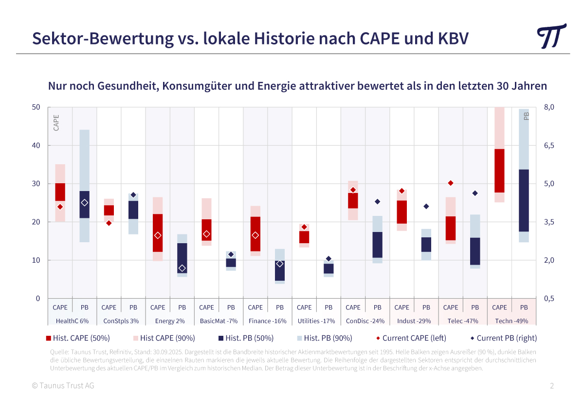 Wir raten Investoren, den Fokus am Aktienmarkt zunehmend abseits des US-Marktes und besonders jenseits der „Magnificent 7“ zu legen. Denn viele Länder und Branchen bieten immer noch attraktive Einstiegsgelegenheiten. Unter den Branchen stechen aktuell vor allem „langweilige“ defensive Branchen wie Gesundheit und nichtzyklischer Konsum hervor, die neben günstiger Bewertung und wenig Investoreninteresse auch ein geringes „Beta“, also weniger Schwankungen als der Gesamtmarkt, mitbringen. Bei den aktuellen Allzeithochs für globale Aktien erscheint uns das durchaus erstrebenswert, denn die nächste Korrektur kommt bestimmt.