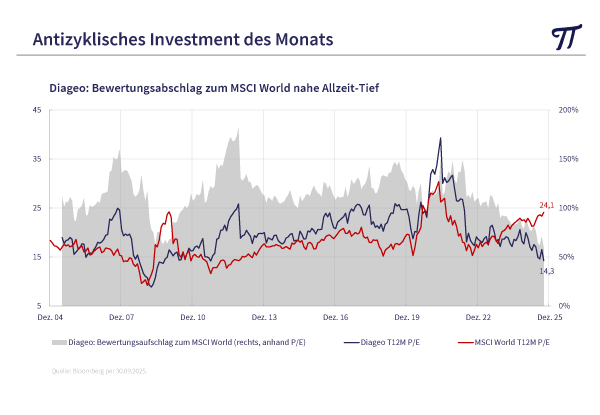 Diageo ist unangefochtener und breit diversifizierter Marktführer in einer attraktiven Branche mit üblicherweise stabilen Ergebnissen, hoher Rentabilität und geringer Konjunktursensitivität. Die letzten Jahre wichen jedoch vom langfristigen Wachstumstrend ab: Covid, eine schwächere Nachfrage in China und die Unsicherheit in den USA (Zolldebatte) belasteten die Branche. Entsprechend sind die Bewertungen derzeit ungewöhnlich niedrig – sowohl absolut als auch im historischen Vergleich. Hinzu kommt eine Dividendenrendite von rund 4%, die das Warten auf eine Normalisierung „versüßt“.